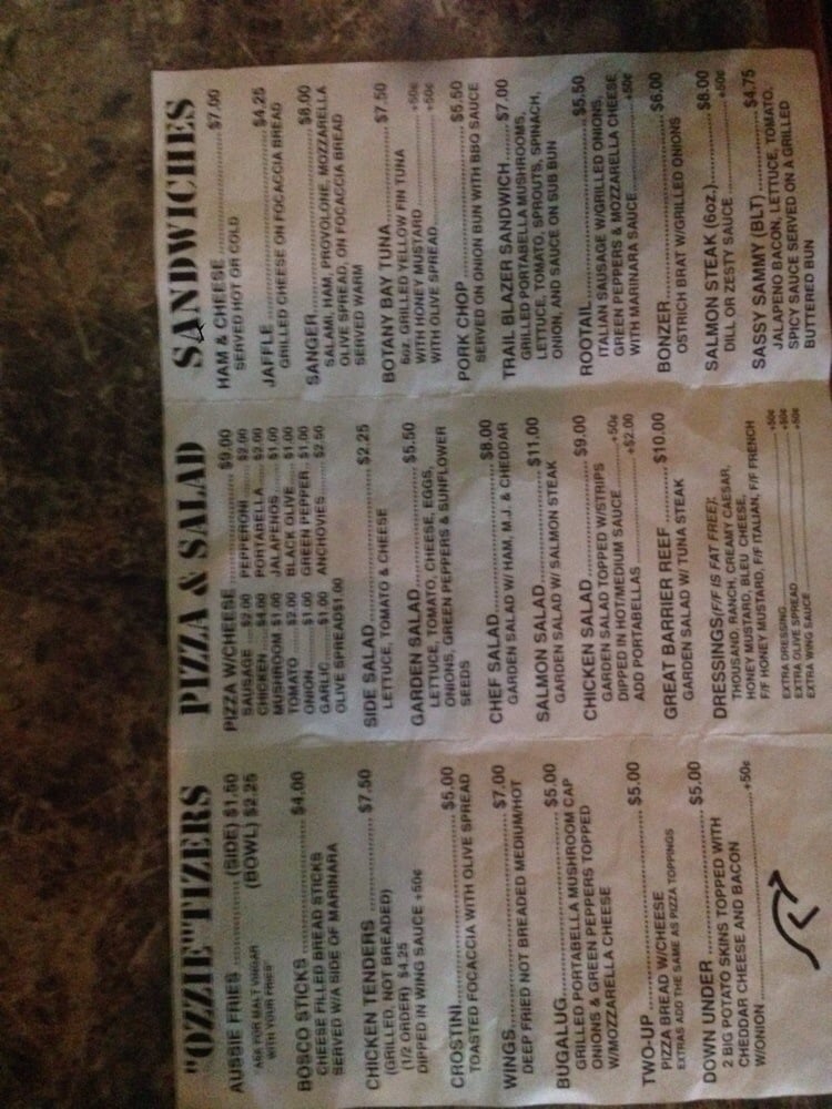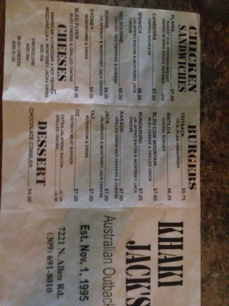 Khaki Jack’s menu boasts an impressive range of offerings. Start with tempting Ozzietizers like the 16 oz. Chicken Tender Grilled or the Bosco Sticks, stuffed with gooey cheese. Then, indulge in one of their standout burgers, acclaimed as the best in Peoria, paired with house-cut fries that are simply irresistible. For those looking for varieties, the Jaffle Sandwich and the Kuban Sandwich are excellent choices.